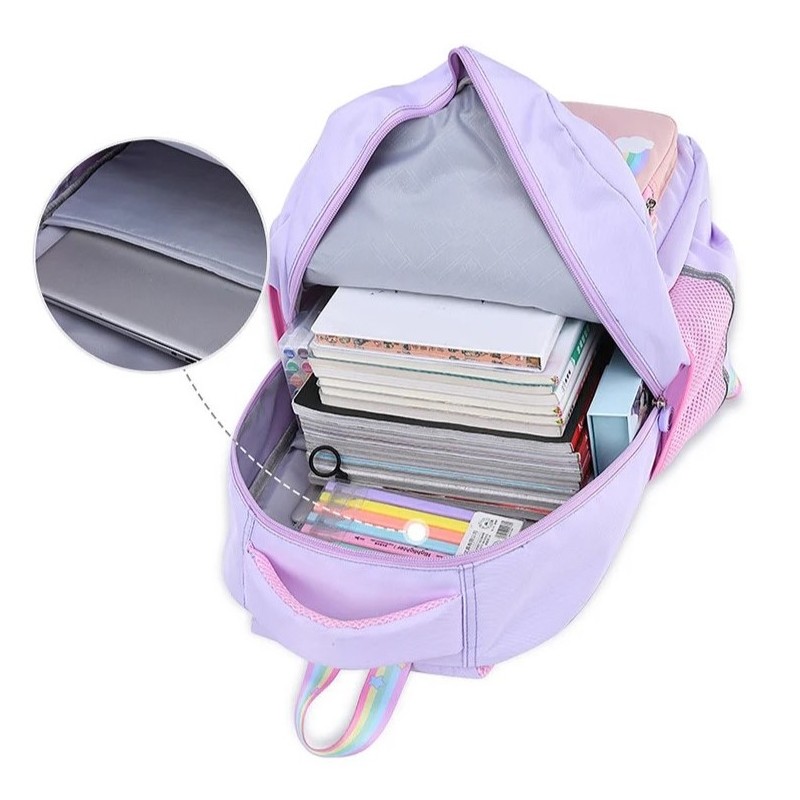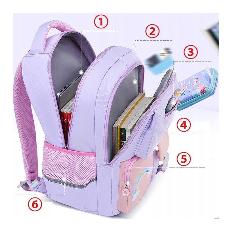 Wodoodporny dziecięcy plecak, szkolny z brelokiemJest bardzo pojemny i praktyczny. Pomieści wszystkie potrzebne rzeczy jak i sprzęt elektroniczny: komputer, tablet, telefon etc.Duża pojemność i przestrzeń do przechowywania, plecak dla dziewcząt, może sprostać różnym potrzebom do szkoły, biura, w podróży.Specyfikacja:- Dwie główne komory pomieszczą książki o standardowych rozmiarach;- Trzy przednie kieszenie są idealne na przybory szkolne, przekąski lub inne małe przedmioty;- Dwie boczne kieszenie mogą dobrze sprawdzić się w trzymaniu butelek z wodą i składanych parasoli;- Tkanina nylonowa, trwała, wodoodporna, odporna na zużycie i rozdarcie, lekka, łatwa do czyszczenia;- Oddychający tylny panel, poszerzone i pogrubione regulowane paski zapewniają wygodę i suchość pleców;- Odblaskowe elementy plecaka zapewniają bezpieczeństwo;- Duża pojemność: 35 litrów Wymiary:45 cm x 30 x 20 cmWaga:770gMateriał:100 % oxfordPodszewka – 100% poliester